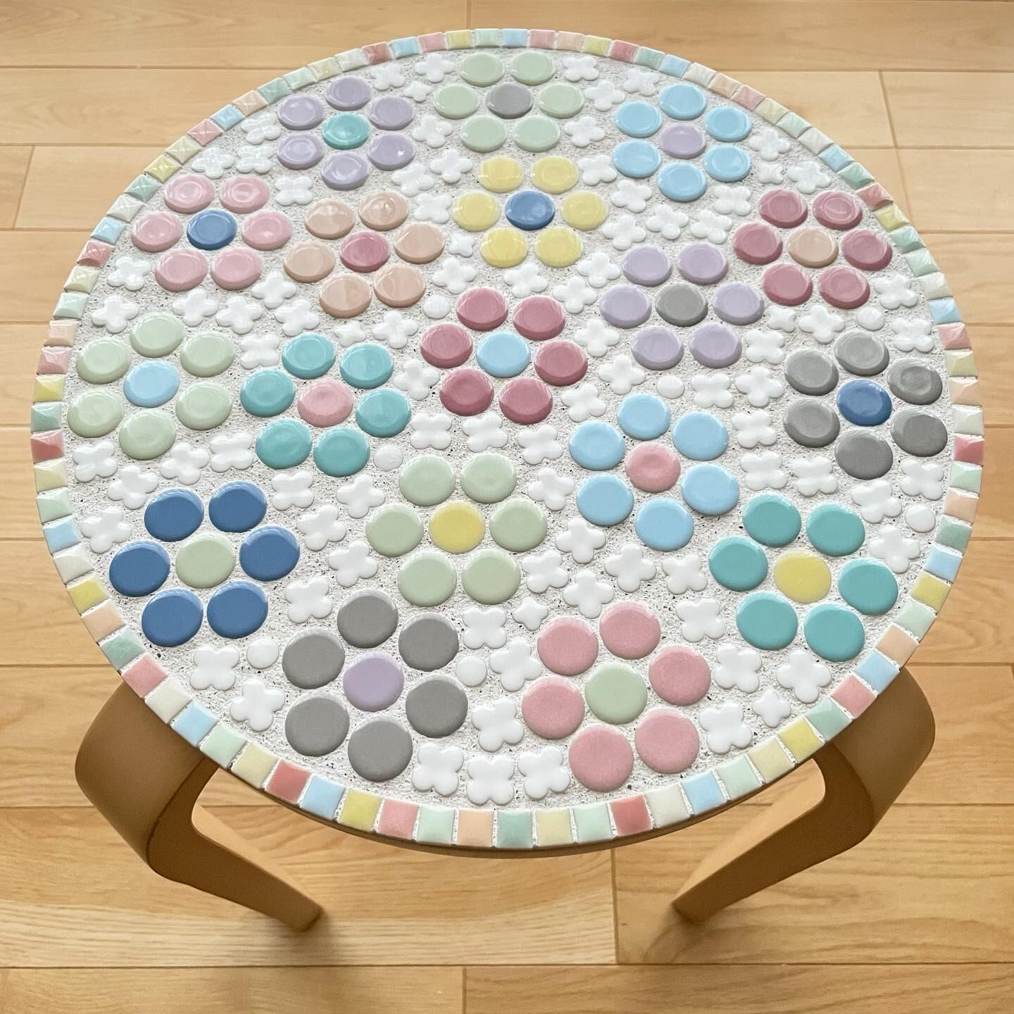 仕様 座面部:繊維板,脚部:合板,表面加工:ラッカー塗装の木製スツールにタイルデザインを施しております